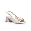 This elegant block heel features a textured upper with a polished metallic buckle detail that adds a refined touch to its open-toe design.