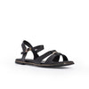 Golden hardware highlights the slender straps on a sandal and secured with an adjustable buckle closure.