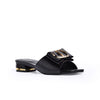 A double bow and sleek upper add visual intrigue to a slide sandal balanced by an angular square toe and low block heel.
