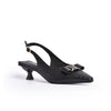 Mixed-media hardware centers a bow at the vamp of a pointy-toe pump lifted by a flare kitten heel and secured with an adjustable slingback strap.