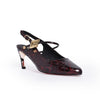 A metal bit accent adds elegance to the straps of this snakeprint pump lofted on a fashion forward, curved heel.
